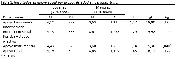 Se analizaron los distintos tipos de apoyo social y el apoyo social total en personas trans en relación con las variables sociodemográficas. No se encuentran diferencias en el apoyo social total (t(34,67)=,342, p=7,34) entre hombres trans (M=4,034;DT=,675) y mujeres trans (M=3,97; DT= ,889) ni en las dimensiones del mismo. Los resultados en función de los grupos de edad se incluyen en la Tabla 3. Sólo se encontraron diferencias en la dimensión apoyo instrumental entre jóvenes y mayores de 26 años. El tamaño del efecto fue medio (r=0.577). Se realizan las mismas pruebas t para comprobar si los resultados por grupos de edades se dan también en el apoyo social estructural. No se encuentran diferencias significativas [t(16,204)= -,117, p=.908] entre la red social de los jóvenes (M= 7,04; DT=4,13) y los mayores (M=7,31; DT= 7,50).