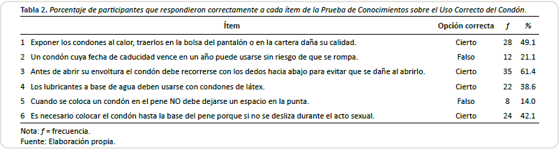 conocimientos adecuados sobre cómo se usa un condón, y quienes reportaron