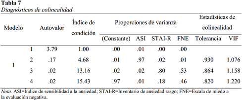 La colinealidad entre los predictores podría producir problemas como coeficientes de regresión muy inestables. Esto se investigó a través de varias pruebas (Tabla 7) como los índices de condición, las proporciones de varianza, la tolerancia de las variables independientes y los factores de inflación de la varianza. No existió colinealidad debido a que los índices de condición no superaron el valor de 30 y cada dimensión solo explicó gran cantidad de varianza de un solo coeficiente (Ramírez Valverde & Ramírez Valverde, 2006), excepto la constante que suele asociarse a los demás coeficientes como en este estudio que se presentó con el STAI-R.