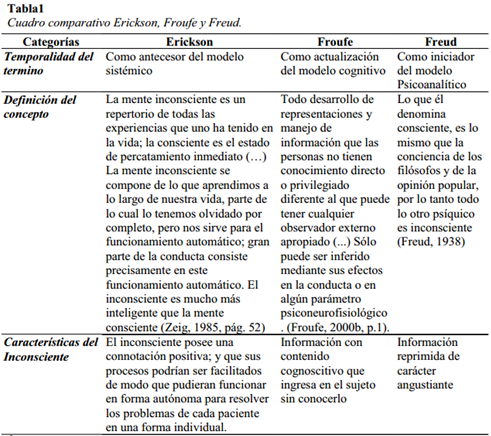 Se pudo concluir que existe una diferencia en lo que respecta al ámbito en la cual se desarrolló el término, siendo clínico en Erickson y Freud y académico-experimental en Froufe. También es importante destacar que la popularidad del inconsciente es notable en Freud, en el caso de Erickson es menor comparativamente hablando, pero no ocurre lo mismo con el inconsciente cognitivo, debido a que su formulación es de reciente aparición y aún no cuenta con desarrollos clínicos, sino más bien experimentales.