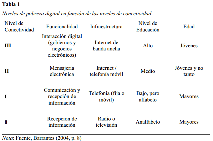 Es evidente que la conectividad marca una interfaz entre la pobreza digital y la no pobreza digital, de modo que se reconoce la existencia de pobres conectados y pobres no conectados. Esta clasificación también toma como base el concepto de alfabetización digital, de modo que un analfabeto digital es alguien que puede ser ubicado en el rango de pobreza digital extrema (Martínez, Pérez & Sampedro). De acuerdo a los estudios de Barrantes (2004), de 17,680 hogares peruanos, 48% califican como pobres y 18% como pobres extremos. En cuanto a la infraestructura, sólo 1 de 4 hogares accede a internet. Además, más del 68% son básicamente receptores de información lo que los ubica como analfabetos funcionales, hablando en un sentido digital. Con respecto a la edad, entre los pobres conectados se ubican jóvenes de entre 13 y 28 años.