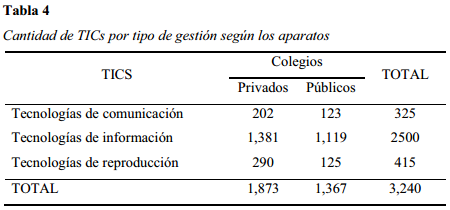 En nuestro estudio se ha evidenciado lo antes dicho, de modo que el 50.65% de los colegios de gestión pública poseen todo un paquete de TICs (computadoras equipadas con CD-ROM, USB, Diskette, internet además de cañón multimedia, software educativo, y otras tecnologías como reproductor de DVD, retroproyector, televisor, teléfono, fax y radio) en comparación con el 62.67% de colegios de gestión privada. Ciertamente el acceso a las TICs en ambos tipos de gestión es menor del que debiera. Y aunque la diferencia entre los colegios públicos y privados parece ser pequeña, si se comparan las cantidades de TICs, (1,367 unidades en la gestión pública y 1,873 en la gestión privada) de los colegios de nuestra muestra, podrá notarse que el acceso a la tecnología educativa en los colegios públicos es mucho menor que en los colegios privados.