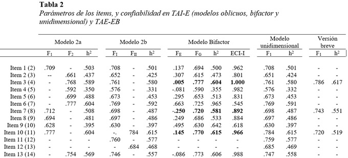 Versión breve: selección de los ítems, análisis estructural y de confiabilidad. A partir del modelo bifactor fueron considerados los ítems que presentaron mayor carga en el factor general (λ > .70), y menos con su factor específico (λ < .20), a fin de garantizar una versión breve y unidimensional. La estructura interna y confiabilidad de esta nueva versión breve (TAI-EB) fue evaluada con los procedimientos ejecutados con la versión extensa (TAI-E).