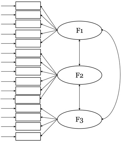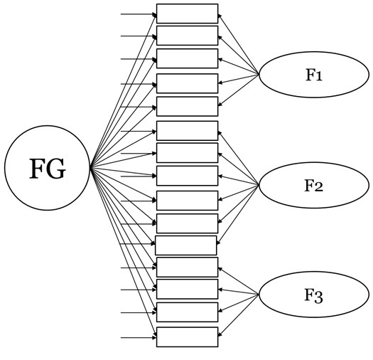 Desde los modelos de ecuaciones estructurales (SEM), los modelos bifactor (Figura 2) se caracterizan por especificar en el modelamiento adicionalmente un FG que influye en todos los ítems de forma simultánea a los FEs (F1, F2, y F3, en la Figura 2). Los FE son modelados ortogonalmente ya que se parte de la hipótesis de que la varianza compartida entre ellos se debe a la presencia de un FG (Reise, 2012). El supuesto general del modelo es que el FG explica una mayor cantidad de varianza de los ítems en comparación a la que explican los FEs. Sin embargo, en ocasiones su evaluación bajo SEM puede llevar a falsos positivos si son considerados únicamente los índices de ajuste.