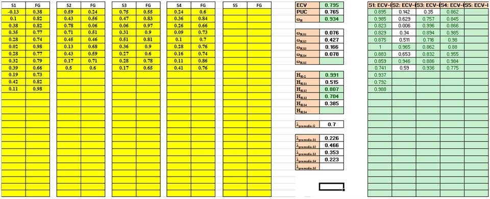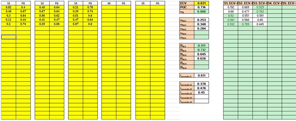 Por ejemplo, en la columna S1 deben colocarse las cargas factoriales estandarizadas del primer FE, y al lado las cargas factoriales de esos ítems en el FG, y repetir el mismo procedimiento para todos los FE existentes (hasta un máximo de cinco FE). Una vez realizado aquello, los cálculos son automáticos. El módulo está disponible al lector sin costo en la sección de material complementario de la revista o escribiendo un correo electrónico al primer autor.