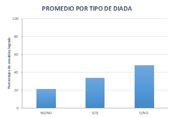 Figura 6. Promedio por tipo de diada. NO/NO significa No compatibilidad entre los miembros de la diada y NO correspondencia con el nivel funcional de las tareas. SI/SI es compatibilidad entre los miembros de la diada y correspondencia con el nivel funcional de las tareas, mientras que SI/NO es compatibilidad entre los miembros de la diana pero NO correspondencia con el nivel funcional de las tareas.