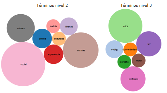 Figura2. Peso terminológico del tema “deontología profesional” de los planes de estudios analizados, divididos por niveles de términos. Se muestra una división en dos figuras a partir de los niveles de términos expresados en el árbol de pertenencias (ningún término del nivel 1 se encuentra presente en los textos). El nivel dos, cuya relación con el tema principal es inferior al nivel 3, tiene mayor presencia semántica que el nivel 3, confirmando de esta forma que el tratamiento de la temática es abordado de manera secundaria, pero aun así se encuentra presente. No se observa en estas figuras, pero es altamente probable que los mayores valores TF-IDF se encuentren reservados para aquellos conceptos específicos del área o tema de estudio de cada materia, por lo que es posible suponer que un tratamiento medio en los PTD del tema “ético-deontológico” se encuentra dentro de un valor “aceptable”.