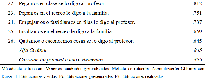 El primer factor obtenido se etiquetó como Situaciones realizadas, tiene una varianza explicada de 26.08 %, se integra por 12 reactivos, los cuales miden la frecuencia en que los alumnos han sido testigos de actos de violencia escolar donde asumen un papel de observador activo para denunciar la situación a figuras de autoridad dentro y fuera de la institución educativa. Este factor está correlacionado de manera positiva con el factor Situaciones presenciadas (r=.124, p=.000) y Situaciones vividas (r=.327, p=.000).
