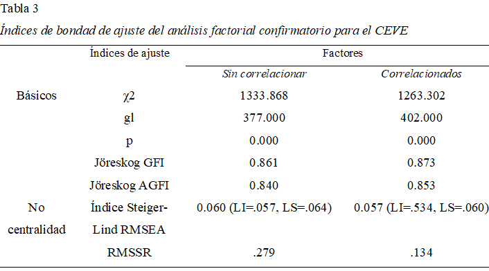 El modelo propuesto en el instrumento demostró un mejor ajuste con los factores correlacionados, el valor de la RMSEA fue de .057, aunque el coeficiente no fue de muy buen ajuste, cumple con el mínimo aceptable para este indicador, los valores de los Índices de Bondad de Ajuste de Jöreskog fueron cercanos a .90.