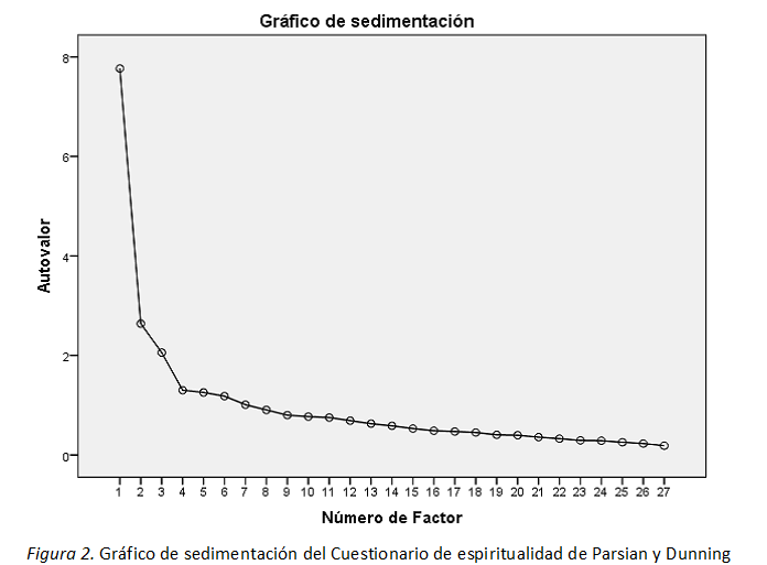 Luego, se decide realizar una extracción con 4 factores según la teoría; sin embargo el cuarto factor está compuesto por 2 ítems, lo cual no justifica considerarlo pues no sería interpretable, ya que se recomienda que cada componente debe contar con un mínimo de 3 ítems (Ferrando & Anguiano-Carrasco, 2010). Por lo tanto, se decidió guiarse del gráfico de sedimentación de Cattell, el cual propone que 3 dimensiones son suficientes para explicar la Espiritualidad, como se observa en la Figura 2. En ese sentido se optó por realizar un segundo análisis asumiendo 3 dimensiones.