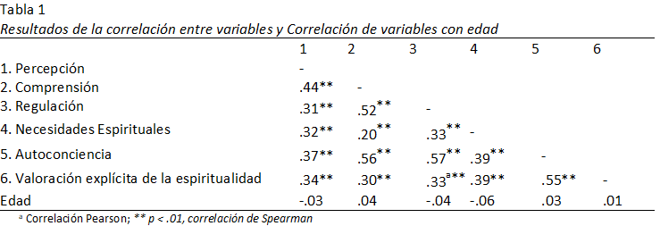Los resultados de las correlaciones, tanto Spearman como Pearson, evidencian una correlación positiva entre todos los componentes. Se ha de resaltar que la dimensión de autoconciencia del Cuestionario de Espiritualidad, presenta las correlaciones más significativas con las dimensiones de Inteligencia Emocional, obteniendo correlaciones fuertes con Regulación (r = .57, r2=.32,) y Compresión (r = .56, r2=.31), y una correlación moderada con la dimensión de Percepción (r =.37, r2=.13). Por otro lado, las demás correlaciones resultaron con un tamaño del efecto moderado (Cohen, 1988) con la única excepción de una correlación débil entre Necesidades espirituales y Compresión (r = .22, r2=.04). De esta manera, se observa que las tres dimensiones de Espiritualidad correlacionan con cada una de las dimensiones de Inteligencia Emocional (Tabla 1).