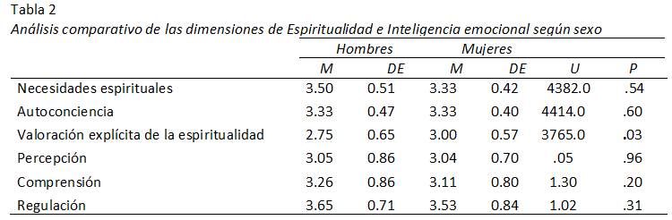 Igualmente, se realizó un análisis comparativo para ver diferencia entre las dimensiones de ambos constructos con el sexo de los participantes. Se realiza nuevamente las pruebas de normalidad para ambos grupos, en el cual obtenemos por resultados que para las dimensiones de Inteligencia Emocional se comparará a través de la prueba T de student, ya que sí se acerca a una distribución normal. Para las dimensiones de Espiritualidad, se usará la prueba U de Mann Whitney, ya que los datos no cumplen con el criterio de normalidad (p> 0.05). Así, se observan diferencias significativas en la dimensión valoración explícita de la espiritualidad (p< 0.05), donde la mediana del grupo de las mujeres es mayor en este caso, como se observa en la tabla 2. En el caso de las dimensiones de Inteligencia Emocional no se encontraron diferencias significativas según sexo (tabla 2) (p> 0.05).
