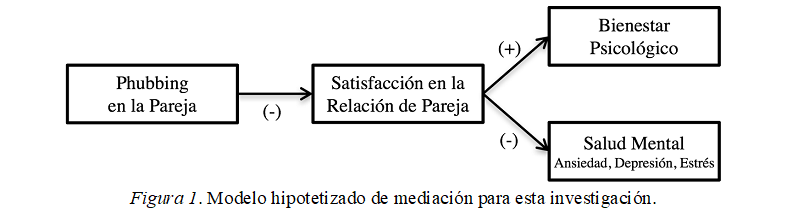 Por otra parte, el uso problemático del celular o el uso de las redes sociales genera conflictos en la pareja, que desencadena síntomas depresivos e insatisfacción, no tan solo en la relación de pareja, sino también en la vida familiar (McDaniel & Coyne, 2016). Esto se debe en su mayoría, a que el celular es un recurso que suele estar siempre presente, activo y a disposición de las personas; por ende, interfiere constantemente en la interacción de la pareja (Jarvenpaa & Lang, 2005). A su vez, varias investigaciones han encontrado correlaciones positivas entre un alto uso de la tecnología, los dispositivos electrónicos y la depresión (Adams & Kisler, 2013; Gentile et al., 2011; Pantic et al., 2012). Por estas razones, argumentamos que el phubbing en la pareja tendrá un efecto indirecto en el bienestar psicológico y la salud mental de los individuos, a través de la satisfacción en la relación de pareja.