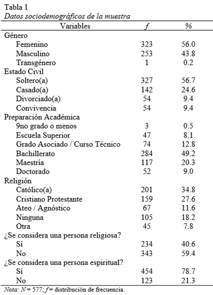El proceso para la selección de los participantes fue por disponibilidad de tipo no probabilístico. Originalmente, 990 personas accedieron al cuestionario en línea a través de la plaraforna PsychData. Sin embargo, solo 577 personas (58%) cumplimentaron el cuestionario en su totalidad y fueron considerados para el análisis de datos. Como criterio para seleccionar el tamaño mínimo de la muestra, seguimos las recomendaciones de MacCallum, Widaman, Preacher y Hong (2001), quienes sugieren un radio conservador de 20 participantes por cada ítem de la escala a evaluar mediante análisis de factores confirmatorios. En nuestro caso, la escala a examinar tiene 12 ítems, lo que sugiere un mínimo de 240 participantes, los cuales casi triplicamos en la recolección de datos. En la Tabla 1 presentamos la distribución sociodemográfica completa. La edad de los participantes fluctuaba entre 18 a 88 años de edad con una media de 33.44 años y una desviación estándar de 12.37.