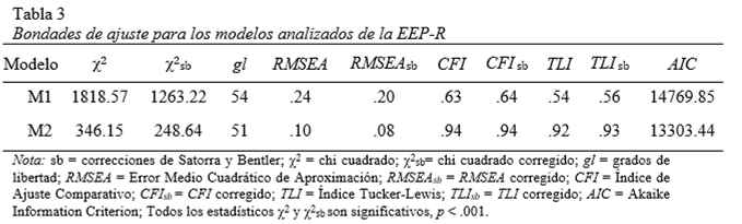En primer lugar, obtuvimos las medias y desviaciones estándar para cada ítem de la EEP-R para analizar las propiedades de distribución de la escala. Las medias de los ítems fluctuaron entre 2.74 y 3.53, con desviaciones estándar que fluctuaron entre .57 y 1.14. Como muestra la Tabla 2, las pruebas de normalidad Kolmogorov-Smirnov y Shapiro-Wilk evidencian que los datos no se distribuyen de forma normal (p < .001). Por la falta de normalidad en los datos, utilizamos las correcciones de Satorra y Bentler (2001) para calcular el ajuste de los modelos de ecuaciones estructurales, ya que la no-normalidad de los datos altera los errores de estimación y el ajuste global del modelo.
