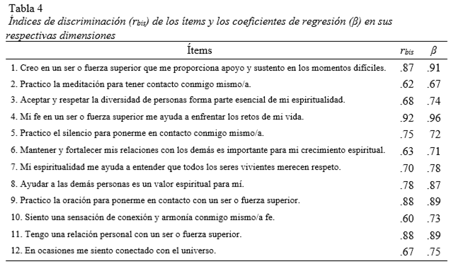 Una vez validada la estructura factorial de la escala, analizamos los índices de discriminación de los tres factores mediante el índice de correlación ítem total. Para el factor de conexión intrapersonal los índices fluctuaron entre .60 y .67; para el factor de conexión interpersonal entre .63 y .78; y para el factor de conexión transpersonal entre .87 y .92. Todos los reactivos obtuvieron índices de discriminación mayores a .30, como recomienda Kline (2005). La Tabla 4 presenta los índices de discriminación de los ítems y los coeficientes de regresión.