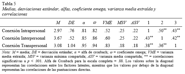 Luego, calculamos los índices de consistencia interna alfa de Cronbach y los coeficientes omegas para los tres factores de la escala (conexión intrapersonal, conexión interpersonal y conexión transpersonal). Los índices alfa de Cronbach de los factores fluctuaron entre .81 y .95, y los coeficientes omegas entre .82 y .94. Estos índices superan el mínimo recomendado por la literatura (.70) para ser considerado un instrumento confiable (Campo- Arias & Oviedo, 2008; Kline, 2005).
