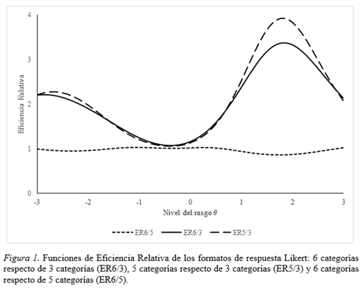 Desde la perspectiva de la TRI se utilizaron las Funciones de Eficiencia Relativa (ER) obtenidas a partir del cociente de las Funciones de información del test con un formato respecto a otro formato para todo nivel de θ. La ventaja de aplicar las funciones de ER es que estas curvas permiten estimar el aporte de información que realiza un formato Likert con respecto a otro en todo el rango de valores de la variable.
