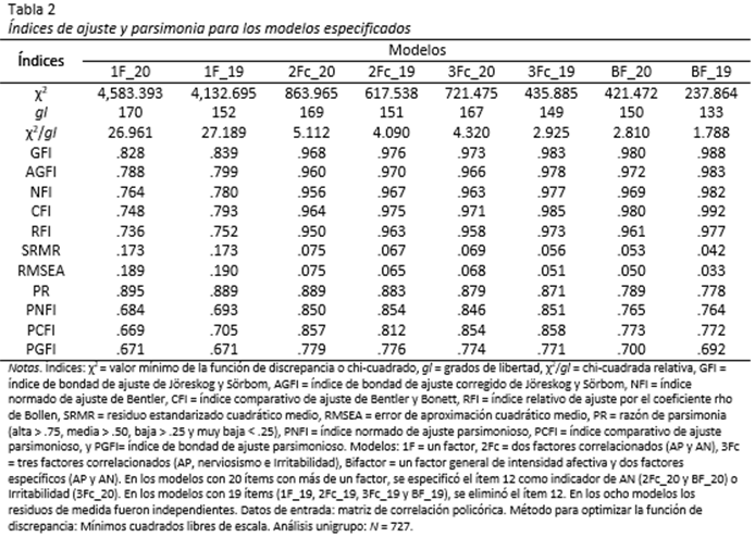 Conforme a la expectativa, inicialmente se especificaron cuatro modelos. Un modelo de un factor con 20 indicadores (1F_20), otro de dos factores correlacionados con 10 indicadores cada uno (2Fc_Esp): ítems 1, 3, 5, 9, 10, 12, 14, 16, 17, 19 como indicadores de AP, e ítems 2, 4, 6, 7, 8, 11, 13, 15, 18 y 20 como indicadores de AN; otro de tres factores correlacionados (3Fc_Esp): AP, ítems 6, 7, 13, 15, 18 y 20 como indicadores de nerviosismo (N), y ítems 2, 4, 8, 11 y 12 como indicadores de irritabilidad (I); y un modelo bifactor: un factor general de IA y dos específicos independientes: AP y AN.