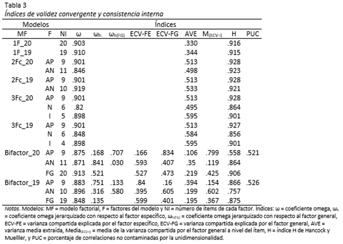 Precisamente, en el modelo de un factor (1F_20), los ocho índices tuvieron valores de mal ajuste (Tabla 2). La consistencia interna de los 20 ítems fue excelente, ω= .90, pero el factor careció de validez convergente, AVE = .33 y H = .92 (Tabla 3).