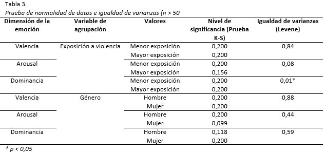 La Tabla 3 presenta los resultados obtenidos en la ejecución de la prueba de normalidad de los datos recolectados, teniendo como variables de agrupación la exposición a violencia y el género. Para esta oportunidad se consideraron los resultados de la prueba Kolmogorov – Smirnov, teniendo en cuenta que el tamaño muestral era superior a 50 participantes (Romero, 2016). Adicionalmente, se consideraron los resultados de la prueba de Levene, con el fin de determinar si los grupos conformados cumplen con el principio de homocedasticidad de la muestra (Rubio y Berlanga, 2011).