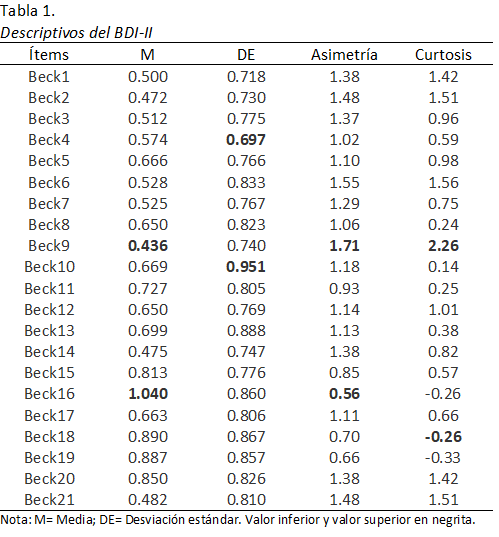 En la Tabla 1 se muestra que la media de los ítems del BDI-II oscilan entre .436 (ítem 9: pensamientos o deseos suicidas) y 1.04 (ítem 16 cambios en los hábitos de sueño). En cuanto a la variabilidad, el ítem 10 muestra la más alta y el ítem 4 la más baja. Los valores de la curtosis y asimetría indican una distribución normal univariada, pues los valores oscilan entre ± 1.5 (Pérez & Medrano, 2010) a excepción del ítem 9. No obstante, el análisis de Mardia (1970) mostró p=1.00 para la asimetría y p<.001 para la curtosis, indicando un exceso de esta.