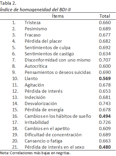 Cuando analizamos el índice de homogeneidad, todos los ítems estuvieron correlacionados por encima del .20 con el total de la escala (Kline, 1993), superando, incluso, criterios más rigurosos pues la correlación ítem – test más baja fue de .48 (pérdida de interés en el sexo), muy cerca al .50 (Hair, Anderson, Tatham & Black, 1999; Robinson, Shaver & Wrightsman, 1991), lo cual sugiere que todos los ítems apuntan hacia la misma dirección y pertenecen al constructo de Depresión.