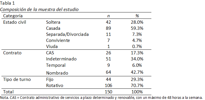 La muestra del estudio se obtuvo por un procedimiento intencional no probabilístico, siendo los criterios de inclusión: con formación profesional en enfermería, sexo femenino y con consentimiento informado; mientras que los criterios de exclusión fueron: personal de enfermería de sexo masculino, formación técnica en enfermería y menos de un año laborando en el nosocomio. Así la muestra quedó conformada por 150 enfermeras, cuyas edades fluctuaban entre 23 y 60 años (M = 41.31; DE = 9.03) y con respecto al tiempo laborando en la institución, el promedio fue de 4.14 años (DE = 3.42), siendo el valor mínimo de 1 año y el máximo de 11 años. En la Tabla 1 se presentan las características de la muestra según estado civil, contrato y tipo de turno.