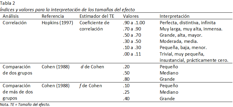 Para el reporte e interpretación de los tamaños de efecto se emplearán los índices y valores de referencia propuestos por Hopkins (1997) para el análisis de correlación y por Cohen (1988) para la comparación entre grupos (Tabla 2). Los análisis se realizaron en Statistical Package for Social Science (IBM® SPSS) versión 24.