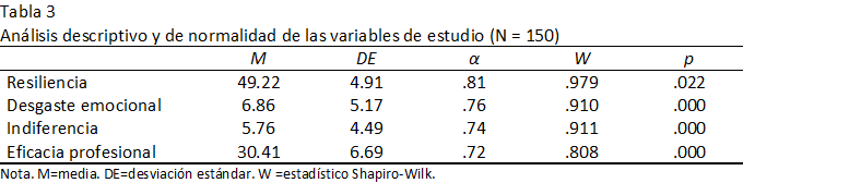 El análisis descriptivo de las variables evidenció que los puntajes en las escalas presentaron distribuciones que no se ajustaron a la curva normal (p > .05) (Tabla 3), estimado con el estadístico Shapiro-Wilks (Razali y Wah, 2011). Considerando este resultado, se emplearon estadísticos no paramétricos para los análisis inferenciales de correlación y de diferencias (Pagano, 2011).