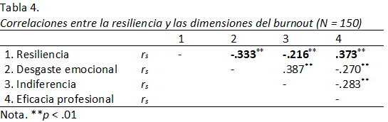 Además, se calcularon los coeficientes de confiabilidad, por el método de consistencia interna, obteniéndose que todas las escalas alcanzaron valores Alfa de Cronbach que superaron el .70 y serían suficientes considerando lo recomendado por Nunnaly y Bernstein (1994). En la tabla 4 se puede apreciar correlaciones significativas y con tamaños del efecto moderados (Hopkins, 1997) entre la resiliencia, el desgate emocional y la eficacia profesional, siendo el primer caso negativo y en el segundo positivo. Con respecto a la relación entre la resiliencia y la indiferencia, el coeficiente calculado resultó ser negativo, significativo y con un tamaño del efecto pequeño.