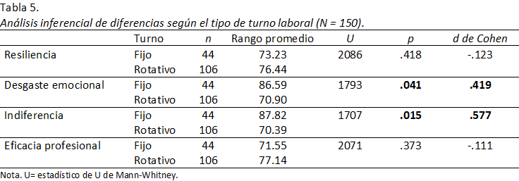 Al comparar las variables de estudio en función al turno laboral, se encontraron diferencias estadísticamente significativas y con tamaños del efecto medianos (Cohen, 1988) entre ambos tipos (fijo y rotativo), siendo las enfermeras con turno fijo las que presentaron mayor desgaste emocional e indiferencia (Tabla 5).