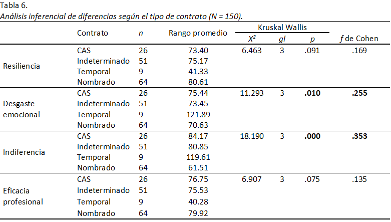 Asimismo, con respecto al tipo de contrato se encontraron diferencias significativas en las dimensiones de desgaste emocional e indiferencia reflejando un mayor impacto en el caso de aquellos que son temporales. Puesto que al no sentir la seguridad en cuanto a la permanencia en sus puestos de trabajo, sumado a las variables económicas asociadas a ello, son más proclives a desarrollar el Síndrome de Burnout. Los resultados encontrados con respecto a la relación entre resiliencia y burnout son congruentes con lo reportado en otras investigaciones (Ju y Oh, 2016; Rushton et al., 2015), ya que la resiliencia está relacionada con adaptarse y sobreponerse al estrés, estas características se oponen al desgaste emocional. De igual manera, las personas resilientes tienden a ser más felices y empáticas, por lo que serían menos indiferentes, a su vez, la percepción sobre la eficacia profesional podría ser tomado como parte de los recursos que las personas pueden usar para contrarrestar las presencia del burnout.