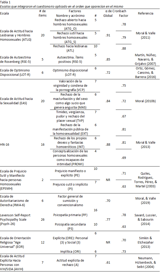 El cuestionario quedó integrado por cuatro preguntas sobre información socio-demográfica (sexo, edad, estado civil y adscripción religiosa), una pregunta sobre religiosidad (¿con qué frecuencia asiste a los servicios religiosos?) con 12 opciones de respuesta (0 = nunca a 12 = seis a siete veces por semana), una pregunta sobre orientación sexual autodefinida “¿cuál es su orientación sexual?” con tres categorías ordenadas de respuesta (1 = “heterosexual”, 2 = “bisexual” y 3 = “homosexual”), la escala de Kinsey (KS) que es una pregunta cerrada sobre la conducta sexual con siete opciones de respuesta (0 = exclusivamente heterosexual a 6 = exclusivamente homosexual) (Kinsey, Pomery, & Martin, 1948), y 18 escalas de medición. Las 18 escalas se administraron en una secuencia fija en el orden en que aparecen en la Tabla 1.