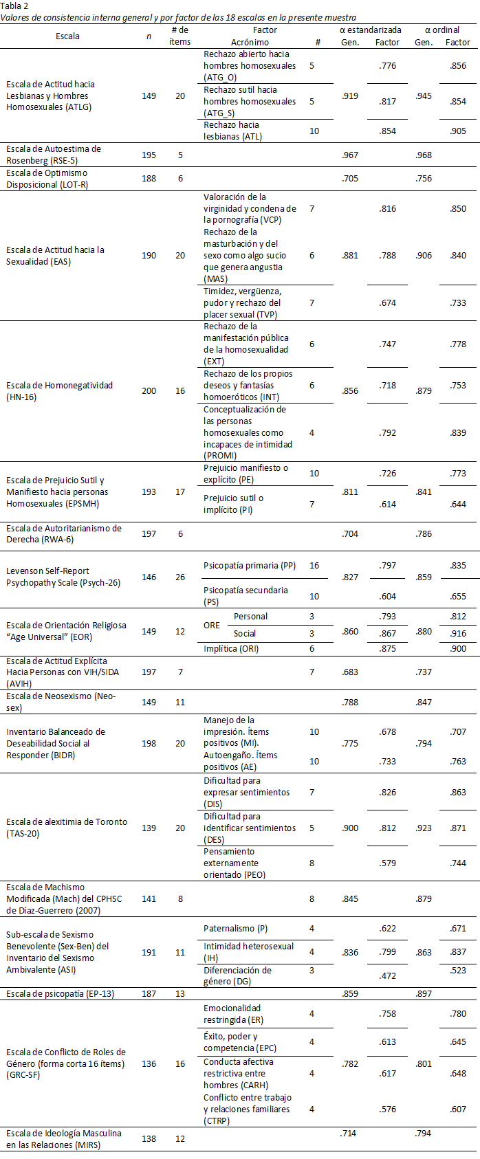 Cuatro de las 18 escalas (RSE-5, ATLG, TAS-20 y EAS) presentaron un nivel de consistencia interna general excelente a través del coeficiente alfa ordinal (α ordinal de .97 a .91). El nivel fue bueno (α ordinal de menor que .90 a .80) en nueve escalas (EP-13, EOR, HN-16, Mach, Sex-Ben, Psych-26, Neo-sex, EPSMH y GRC-SF) y aceptable (α ordinal de .79 a .74) en las cinco escalas restantes (BIDR, MIRS, RWA-6, LOT-R y AVIH). El valor alfa ordinal promedio fue de .85, variando de un mínimo de .74 en AVIH a un máximo de .97 en RSE-5 (Tabla 2). Por tanto, los instrumentos de medida mostraron confiabilidad por consistencia interna. En la Tabla 2, también se reportaron los valores por el coeficiente alfa de Cronbach estandarizado a efectos de comparación con estudios previos. Sus valores fueron ligeramente menores (α estandarizada de .68 a .97 con un promedio de .82). Esto se debe a que el alfa de Cronbach se calcula desde la matriz de correlaciones de Pearson y este coeficiente de correlación infra estima la relación lineal entre dos variables ordinales frente a la correlación policórica. Por su parte, el alfa ordinal se calcula desde la matriz de correlación policórica, usando la fórmula del coeficiente alfa estandarizado, la cual está basada en el supuesto de ítems tau-equivalentes (Chalmers, 2018).