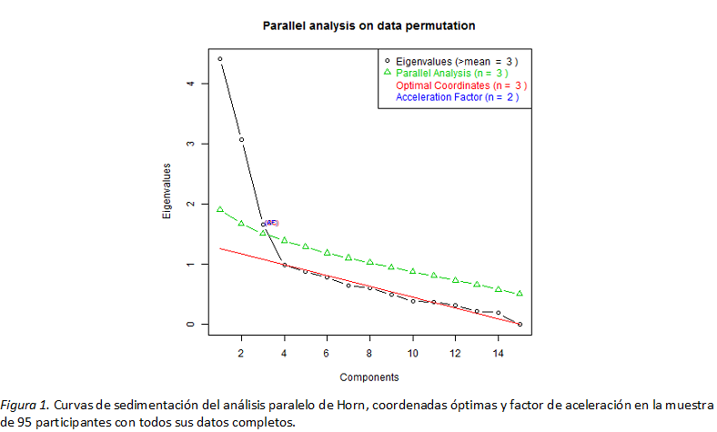 Debido a la alta colinealidad de los 15 correlatos de la puntuación total de la HN-16, se redujo el número de variables usando análisis de componentes principales. Al analizar la matriz de correlaciones de estas 15 variables entre los 95 participantes con todos sus datos completos, el número de componentes fue tres por el análisis paralelo de Horn, coordenadas óptimas, media mínima de las correlaciones parciales a la cuarta potencia (criterio revisado de Velicer) y autovalores mayores que uno (criterio de Kaiser) (Figura 1).