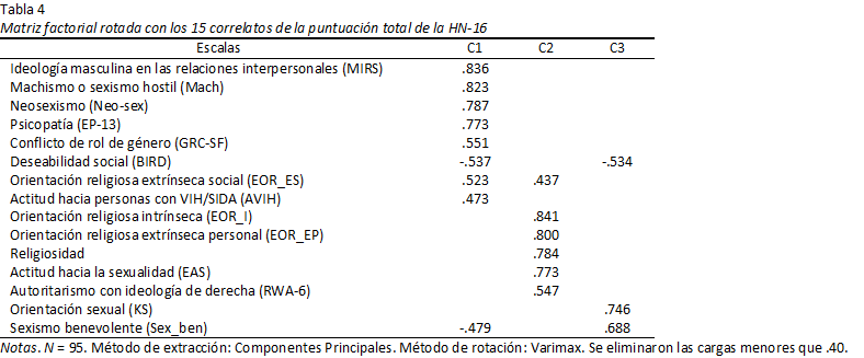 Al extraer tres componentes se explicó el 59.9% de la varianza total. Tras la rotación ortogonal por el método Varimax, el primer componente explicó el 27.8% de la varianza total; quedó integrado por ocho variables con cargas mayores que .40; y por su contenido se denominó componente de masculinidad-dureza-externalidad (ideología masculina en las relaciones interpersonales [MIRS], sexismo hostil [Mach], neosexismo [Neo-sex], psicopatía [EP-13], conflicto de rol de género [GRC-SF], deseabilidad social [BIDR], orientación religiosa extrínseca social [EOR_ES] y aceptación de las PVVS [AVIH]). El segundo componente explicó el 21.9% de la varianza total, quedó integrado por cinco escalas con cargas mayores que .50, y por su contenido se denominó componente de religiosidad-conservadurismo (orientación religiosa intrínseca [EOR_I], orientación religiosa extrínseca personal [EOR_ES], frecuencia de asistencia a los servicios religiosos [Religiosidad], actitud de rechazo hacia la sexualidad [EAS] y autoritarismo con ideología de derecha [RWA-6]). La escala de orientación religiosa extrínseca social presentó su segunda carga más alta y mayor que .40 en este componente. El tercer componente explicó el 10.2% de la varianza total; quedó integrado por dos escalas con cargas positivas mayores que .60 (orientación sexual [KS] y sexismo benevolente [Sex_ben]), aparte la escala de deseabilidad social tuvo su segunda carga más alta, negativa y menor que -.50 en este componente; y por su contenido se denominó componente de homosexualidad-caballerosidad-sinceridad (Tabla 4).