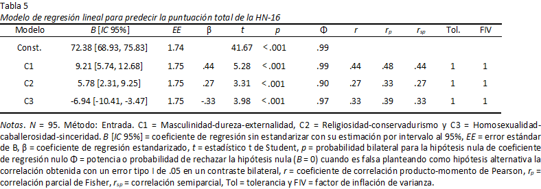Con estas puntuaciones en los componentes se calculó un modelo de regresión lineal múltiple para predecir la puntuación total de la HN-16 por el método de entrada. El modelo fue significativo (F[3, 91] = 18.194, p < .001), con una potencia de .99 para un nivel de significación de .05, y explicó el 35.4% de la varianza de la puntuación total de la HN-16. Los tres predictores fueron significativos, siendo la potencia del contraste alta. Mayores niveles de masculinidad-dureza-externalidad y religiosidad-conservadurismo predijeron mayor nivel de homonegatividad. Por el contrario, homosexualidad-caballerosidad-sinceridad predijo menor nivel de homonegatividad. El tamaño del efecto de masculinidad-dureza-externalidad y homosexualidad-caballerosidad-sinceridad fue mediano, y el de religiosidad-conservadurismo pequeño (Tabla 5).