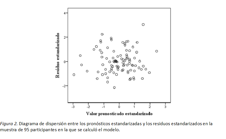Los índices de tolerancia e inflación de varianza de los tres predictores fueron unitarios, indicando independencia de los mismos (Tabla 5). Con respecto al cumplimiento de los supuestos de la RLM en los residuos, la distribución de los mismos se ajustó a una curva normal por la prueba de Kolmogorov-Smirnov-Lilliefors (Max. │D│ = 0.087, p = .074) y de Jarque-Bera (JB = 4.471, p = .107). Los residuos fueron homocedásticos por la prueba de White (W = 7.220, p = .125) y como puede observarse por la apertura homogénea de la nube de puntos en el diagrama de dispersión definido por los pronósticos estandarizados en el eje horizontal y los residuos estandarizados en el eje vertical (Figura 2). Además, los residuos no presentaron correlación serial (orden de muestreo) por la prueba de Durbin-Watson (DW = 2.042, p > .05; 4 – DW = 1.958 > límite superior = 1.732 para un modelo con intercepto con tres regresores calculado con un tamaño de muestra de 95 y un nivel de significación de .05), ni tendencia lineal en el diagrama de la Figura 2. Por tanto, se pueden considerar independientes.
