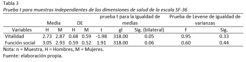 Se encontraron diferencias estadísticas significativas entre hombres y mujeres respecto a la dimensión de vitalidad y función social, en donde las mujeres tienen puntajes más altos en su sentimientos de energía y vitalidad que los hombres (d Cohen= 0.22), no obstante en lo que refiere a la función social los hombres tienen puntajes más altos que las mujeres (d Cohen= 0.29). (Dominguez-Lara, 2018). Los resultados obtenidos mediante la prueba d de cohen permiten afirmar que la magnitud del efecto de una variable sobre otra es pequeña.