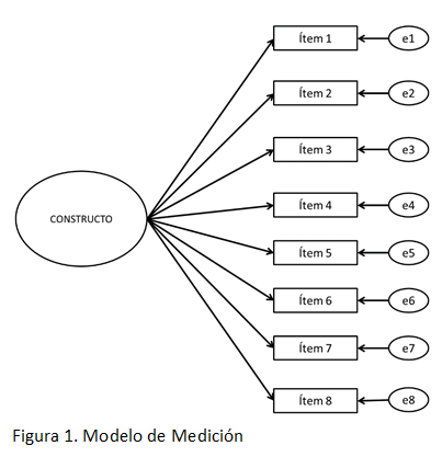 Como se puede apreciar (Figura 1), en un modelo confirmatorio, además de la variable latente y las cargas factoriales, cada ítem posee un término de error, comúnmente conocido como residual (e), que representa la influencia de una fuente de error distinta al constructo evaluado, y puede ser atribuible a diferentes aspectos tanto del individuo (algún estado o rasgo; incluso alguna condición física) como del instrumento o la situación de evaluación.