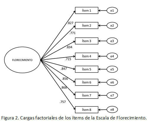 Para ilustrar esta situación, fueron considerados los datos de la Escala de Florecimiento (EF) de Diener et al. (2010) en su versión peruana (Cassaretto & Martínez, 2017), la cual fue administrada como parte de una investigación de mayor envergadura aprobada por la universidad del autor del trabajo. La EF está conformada por ocho ítems en escalamiento Likert de siete opciones (desde Totalmente en desacuerdo hasta Totalmente de acuerdo) que son influidos predominantemente por un solo constructo (modelo unidimensional; Figura 1).