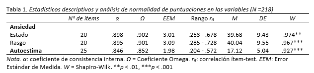 Los resultados del análisis de la bondad de ajuste a la curva normal –realizado mediante la prueba Shapiro-Wilk (W)- indican que, las puntuaciones en el inventario de autoestima, y en los cuestionarios de ansiedad estado y rasgo obtuvieron estadísticos con valores significativos, es decir dichas variables presentan una forma de distribución que no se aproxima a la normal a nivel poblacional (Tabla 1). Es debido a estos resultados que los análisis inferenciales se realizaron empleando estadísticos no paramétricos.