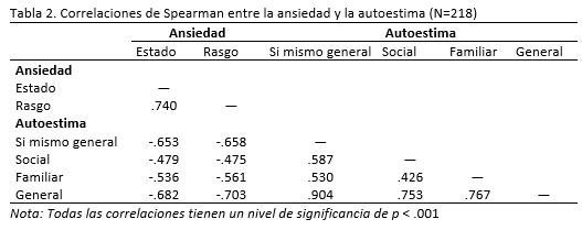 A partir del análisis se obtiene una relación moderada negativa y estadísticamente significativa entre la autoestima y ansiedad estado, siendo el tamaño del efecto alto. También se puede observar que existe relación moderada negativa y significativa entre la autoestima y ansiedad rasgo (Tabla 2), con un tamaño del efecto alto.