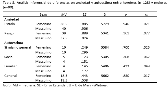 En la tabla 3 se pueden apreciar las comparaciones en las variables de estudio según sexo, encontrándose que no existen diferencias estadísticamente significativas en autoestima (áreas y global) tampoco en ansiedad (estado y rasgo), obteniéndose en todos los contrastes tamaños del efecto insignificantes (rb < .10).