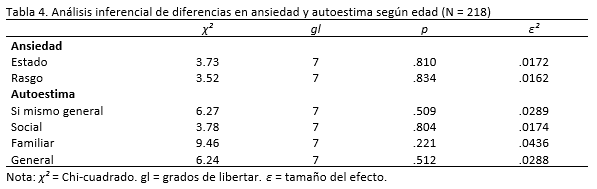 En el análisis según la edad de los participantes, se puede observar en la Tabla 4 que no existen diferencias estadísticamente significativas en autoestima, ansiedad estado y ansiedad rasgo, siendo los tamaños del efecto asociados insignificantes (ε² < .10).