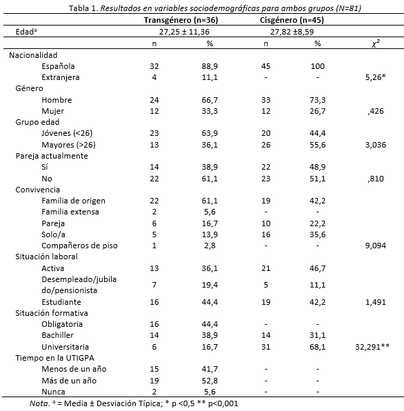 Se encontraron diferencias estadísticamente significativas en nacionalidad y situación formativa. La totalidad de las personas cisgénero tienen nacionalidad española, a diferencia de las personas trans. Con respecto a la situación formativa, ninguna persona cisgénero tiene únicamente formación obligatoria y el porcentaje de personas con formación universitaria es bastante superior (68,1%) que en las personas trans (16,7%).