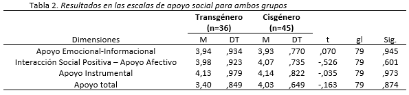 Los resultados hallados para el apoyo social se incluyen en la Tabla 2. No se han encontrado diferencias estadísticamente significativas ni en las tres dimensiones ni en el apoyo social considerado globalmente.