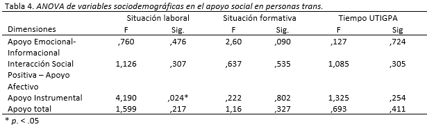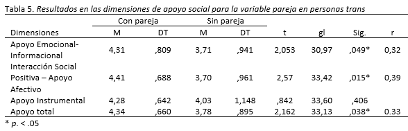 Se encontraron diferencias estadísticamente significativas en cuanto a la situación laboral en el apoyo social instrumental (F(2)=4,190, p=.024). Las comparaciones post-hoc mostraron que había diferencias significativas en el apoyo social instrumental entre personas activas (M=4,38; DT=,625) y desempleadas o jubiladas y pensionadas (M=3,25; DT=1,587), p=0,34) y entre desempleadas y estudiantes (M=4,312, DT=,6800) con una p=0.41. Los resultados para la variable pareja se incluyen en la Tabla 5.