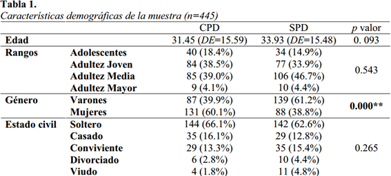 La prevalencia del consumo de sustancias SPD fue del 51%, siendo el 60% de sexo masculino; en relación a su estado civil, el 62.6% de los sujetos eran solteros. Respecto al nivel de instrucción alcanzado, el 50.2% cursó estudios secundarios. En el grupo CPD, el 60% fue de sexo femenino, siento un 66.1% del total de estos sujetos solteros, con nivel educativo secundario (49.6%). Estos datos reflejan la vulnerabilidad para el grupo de edad ante el consumo de sustancias. Sobre la ocupación (presente al momento de su ingreso), en el caso de ambos grupos (CPD y SPD) un 31.2% y un 16.7% eran estudiantes. De igual modo, un 21.1% y un 26.4% se encontraban desocupados en cada grupo.